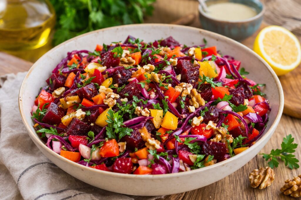 Πρόκειται για μια πολύχρωμη σαλάτα γεμάτη φρεσκάδα και έντονα αρώματα. Τα βασικά της υλικά, όπως το παντζάρι, οι πιπεριές, το κρεμμύδι, το καρότο και το κόκκινο λάχανο, αποτελούν πλούσια πηγή βιταμινών και θρεπτικών στοιχείων. Συγκεκριμένα, προσφέρουν βιταμίνες Β9 (φυλλικό οξύ), Α, C, Β6, Κ και Β1, ενώ παράλληλα περιέχουν ωφέλιμα λιπαρά οξέα Ω3 και Ω6 που συμβάλλουν στη σωστή λειτουργία του οργανισμού.
