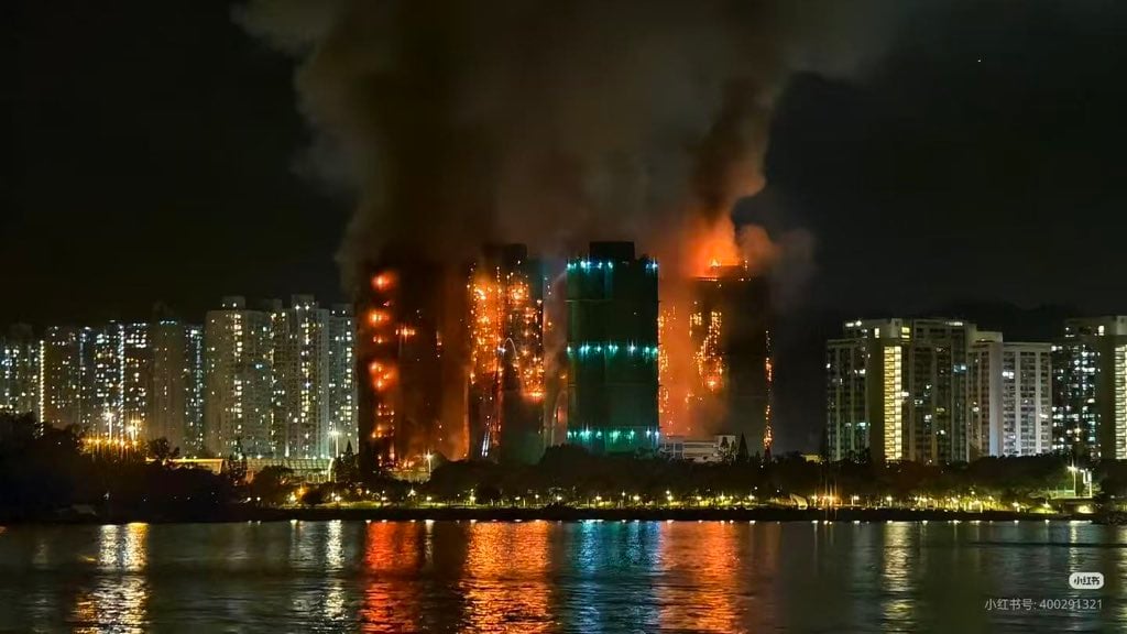 Βίντεο από την περιοχή δείχνουν τις φλόγες να τυλίγουν τις εξωτερικές σκαλωσιές από μπαμπού, οι οποίες λειτουργούν σαν εύφλεκτο περίβλημα των διαμερισμάτων. Ταυτόχρονα, κομμάτια από τα πράσινα προστατευτικά πλέγματα καταρρέουν φλεγόμενα στο έδαφος.