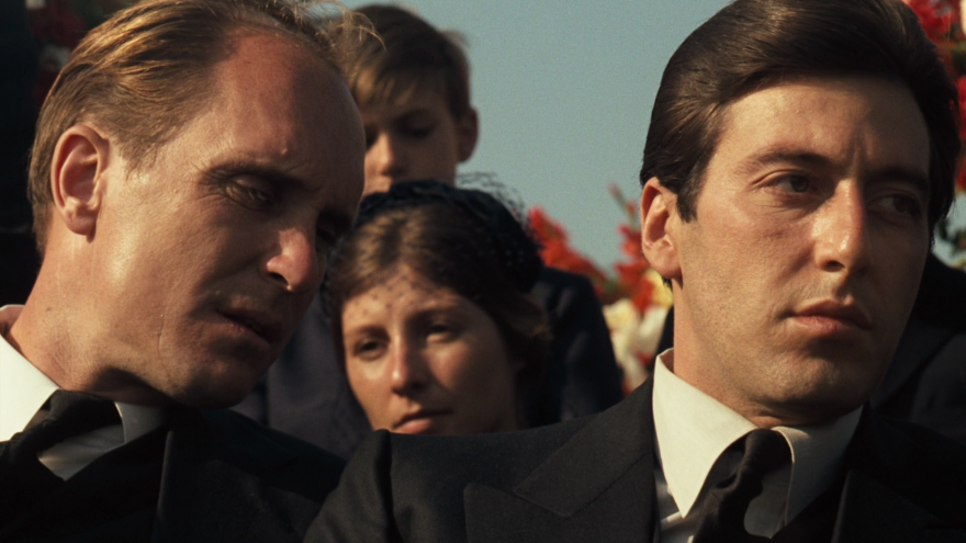 Robert Duvall as Tom Hagen and Al Pacino as Michael Corleone at Don Vito's funeral in "The Godfather" (1972).