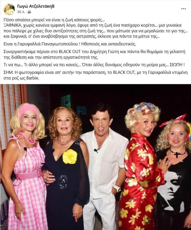 Η συνάδελφός της και επίσης ηθοποιός, Γωγώ Αντζολετάκη, την αποχαιρέτησε με μια συγκινητική ανάρτηση: