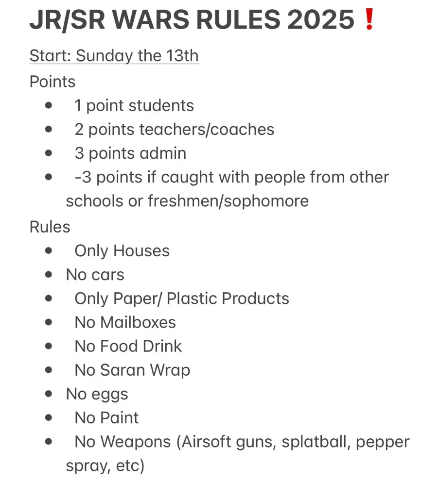Μια φωτογραφία που δημοσιεύτηκε σε σελίδα στο Instagram αφιερωμένη στους μαθητικούς «πολέμους» φαρσών δείχνει το εξωτερικό του σπιτιού του Χιουζ καλυμμένο με χαρτί υγείας ήδη από τον Μάρτιο του 2023. Στην εικόνα αναγραφόταν: «Μαθητές προτελευταίας τάξης +4».