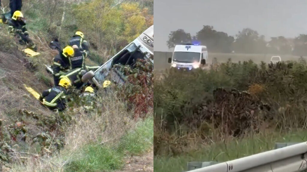 Σε φωτογραφίες που έδωσαν στη δημοσιότητα οι τοπικές αρχές, το λεωφορείο φαίνεται αναποδογυρισμένο μέσα σε ένα χαντάκι στην άκρη του δρόμου.