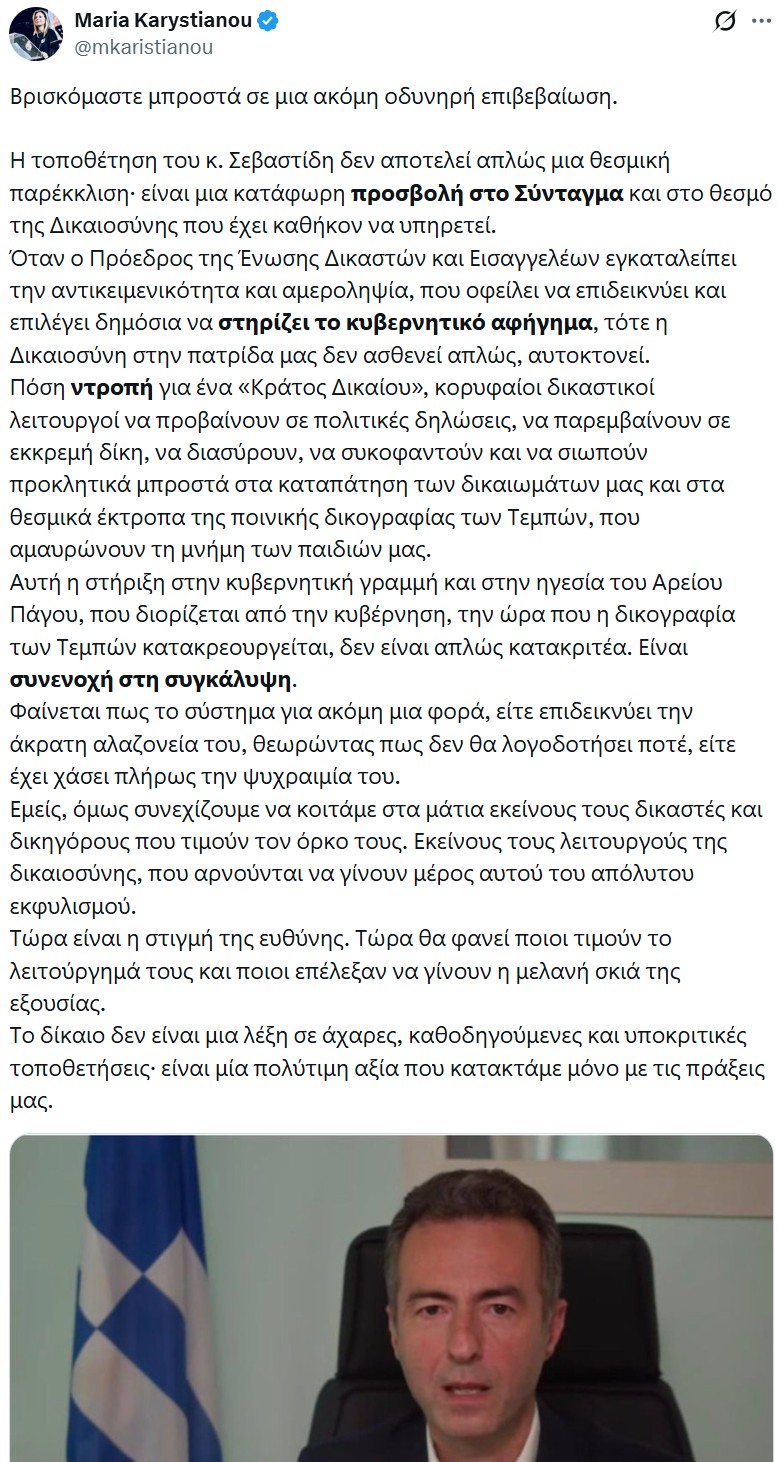Σε ανάρτησή της στην πλατφόρμα Χ, η κα. Καρυστιανού ανέφερε: