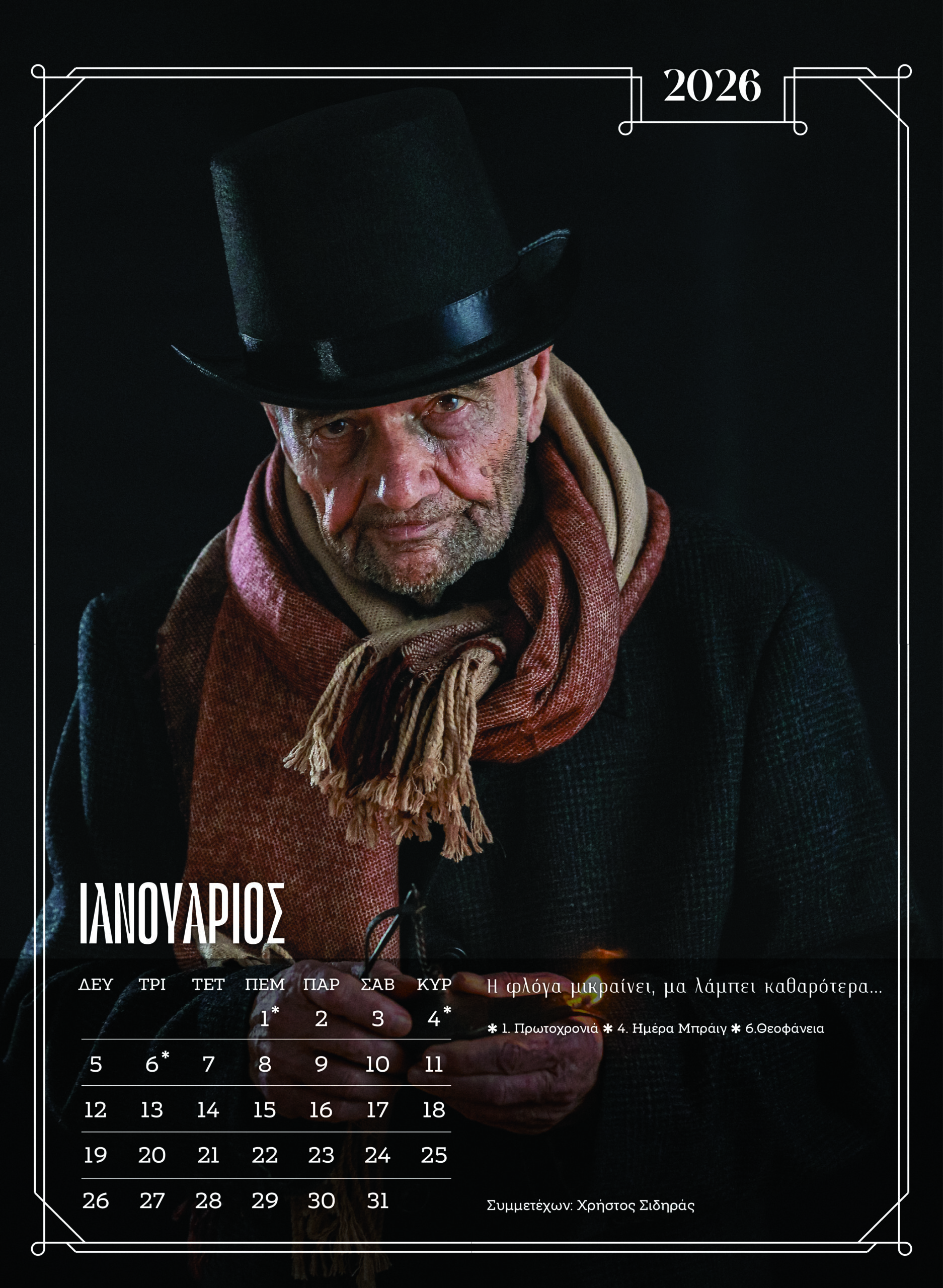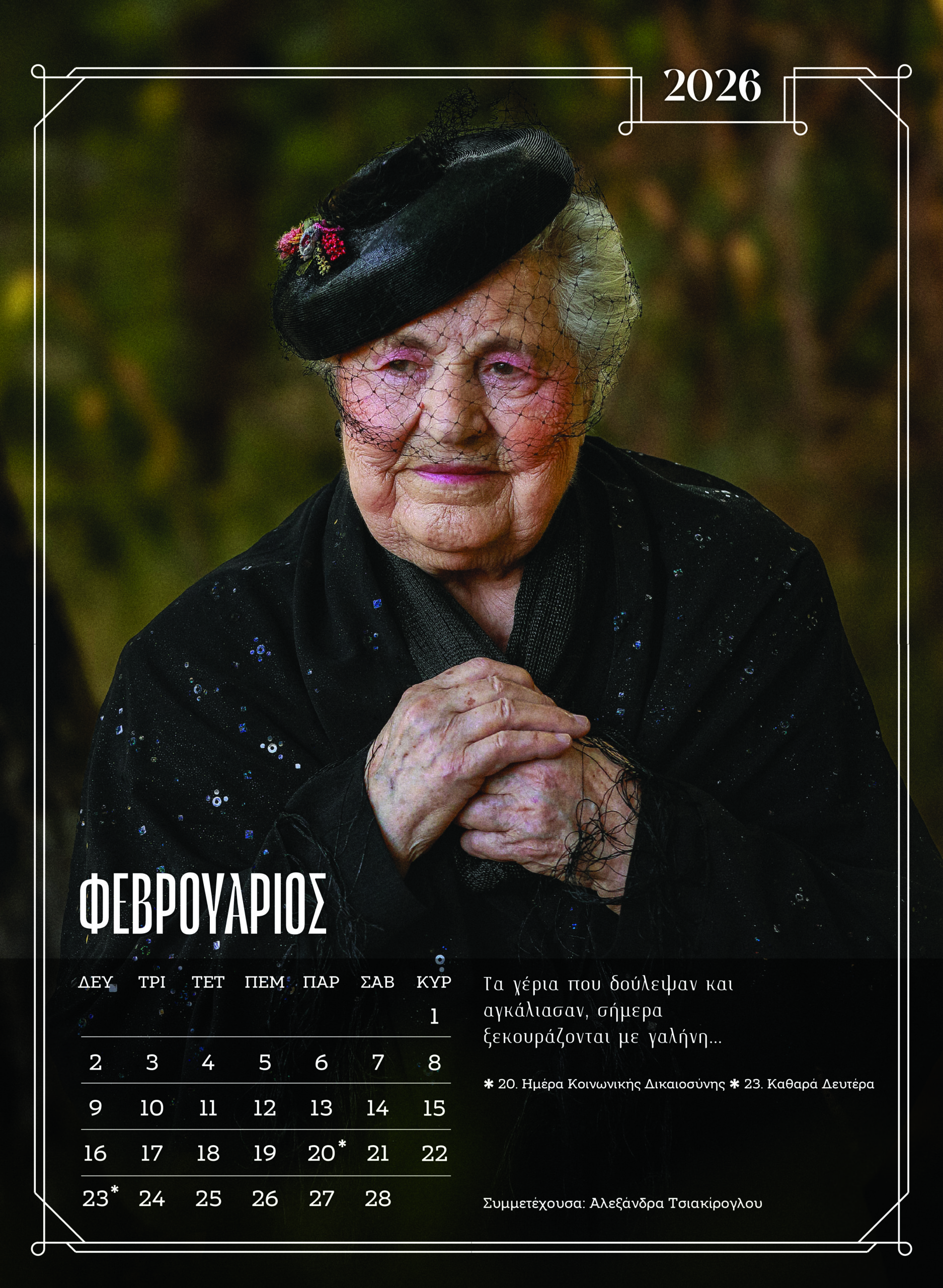 Ο Ιανουάριος ανοίγει με τον Χρήστο Σιδηρά, «μια φλόγα που μικραίνει, μα λάμπει καθαρότερα». Ένας συμβολισμός για όλους εκείνους που δεν έπαψαν ποτέ να φωτίζουν, παρά την κούραση. Ο Φεβρουάριος ανήκει στην Αλεξάνδρα Τσιακίρογλου, με τα χέρια που «δούλεψαν και αγκάλιασαν» και σήμερα ζητούν τη δική τους ηρεμία.