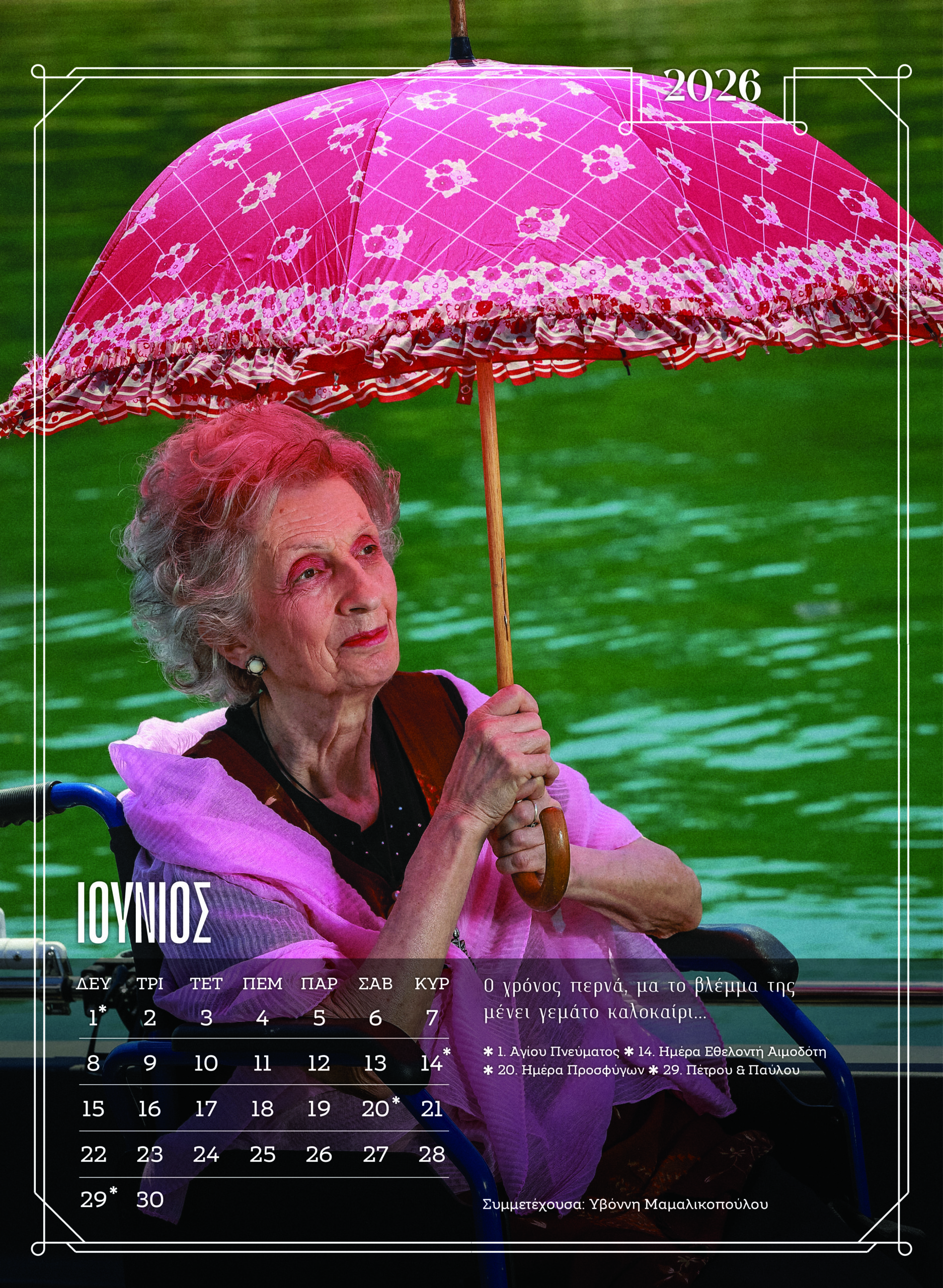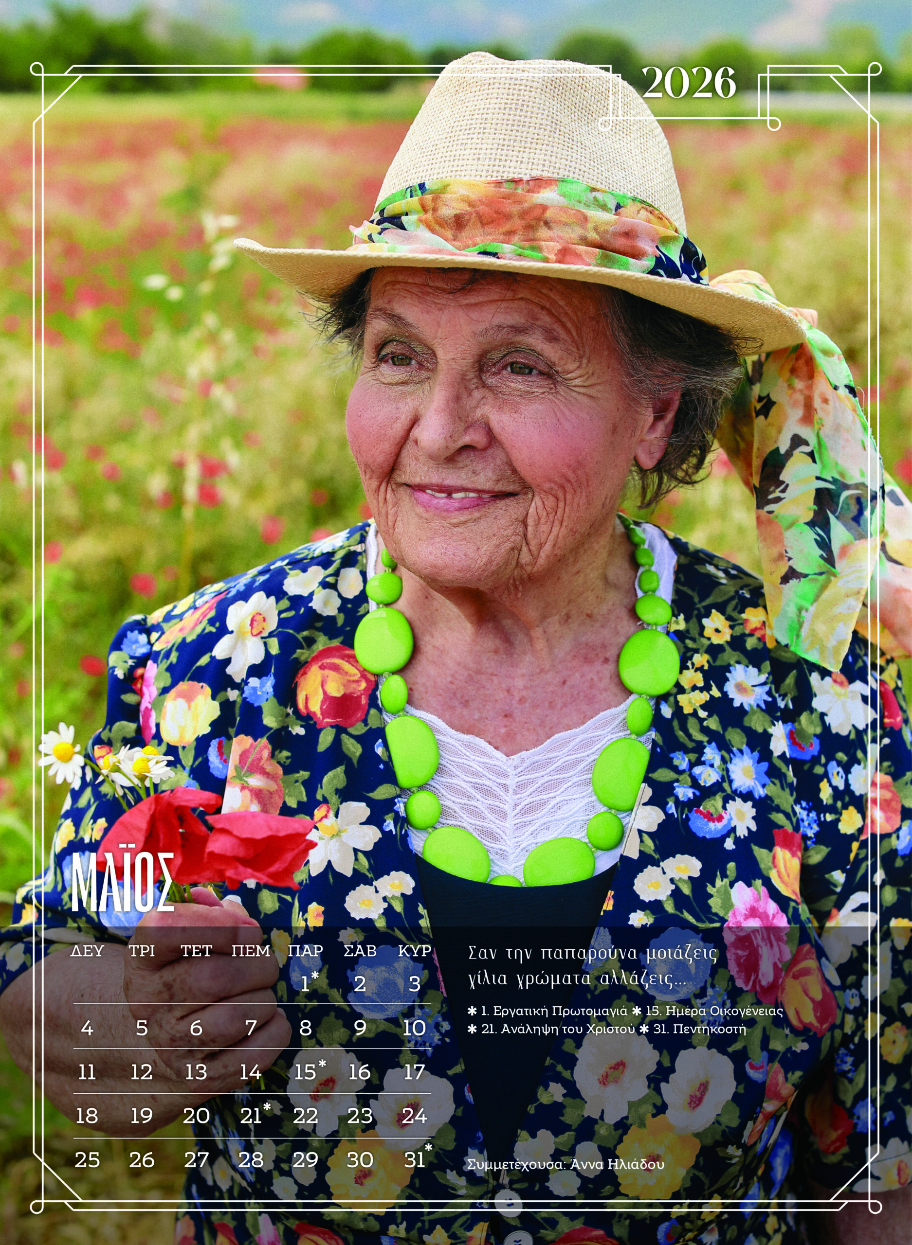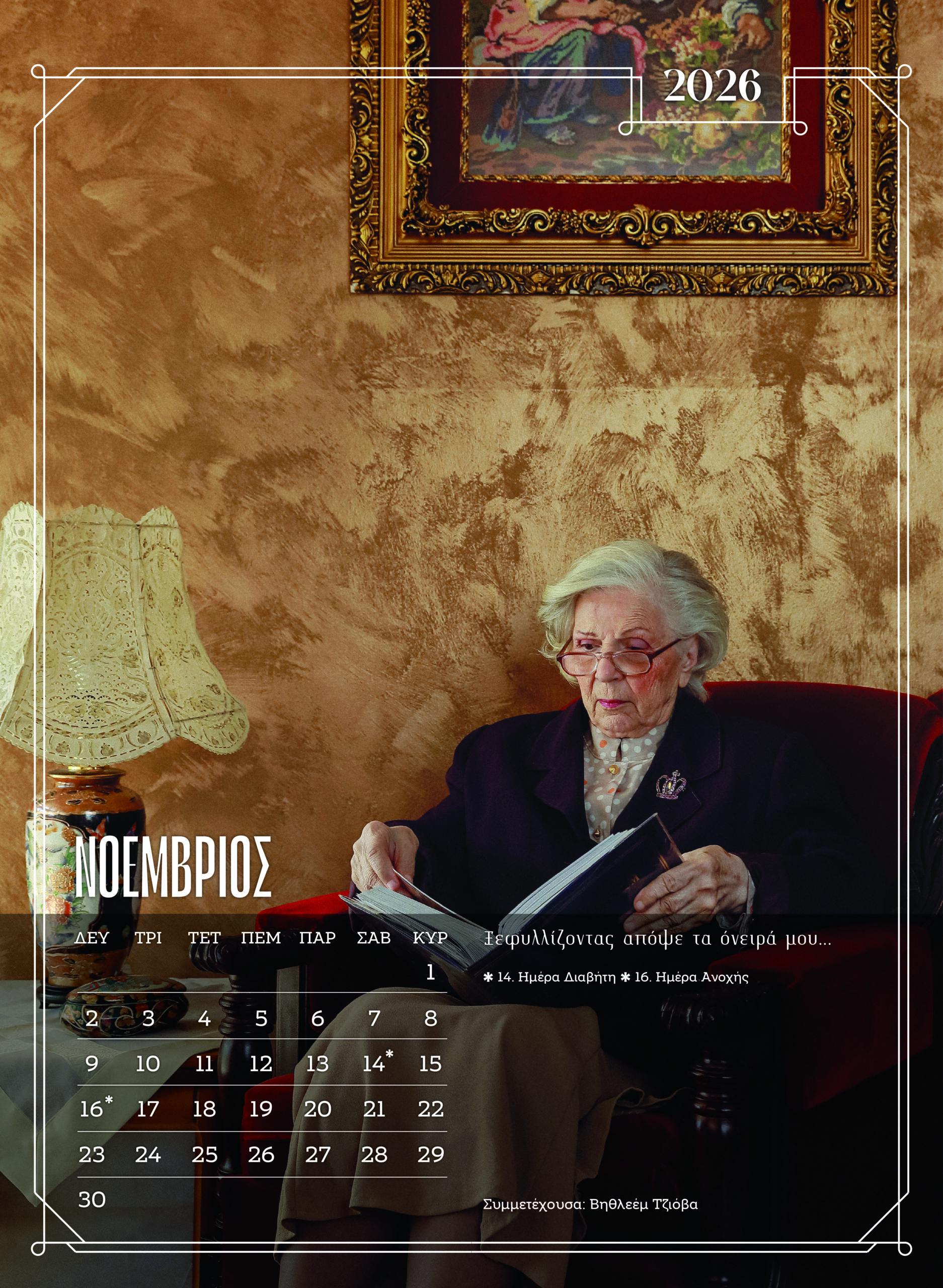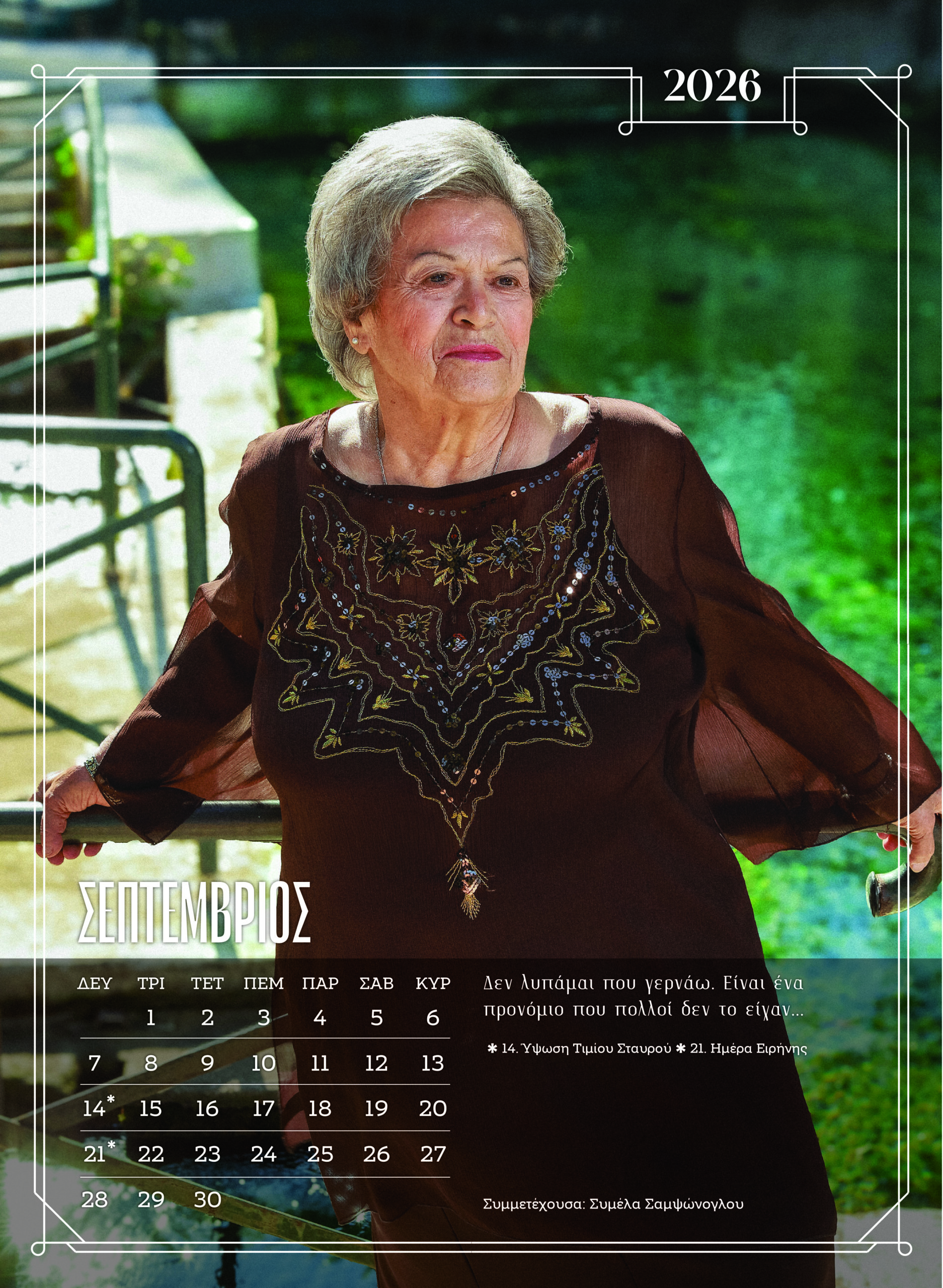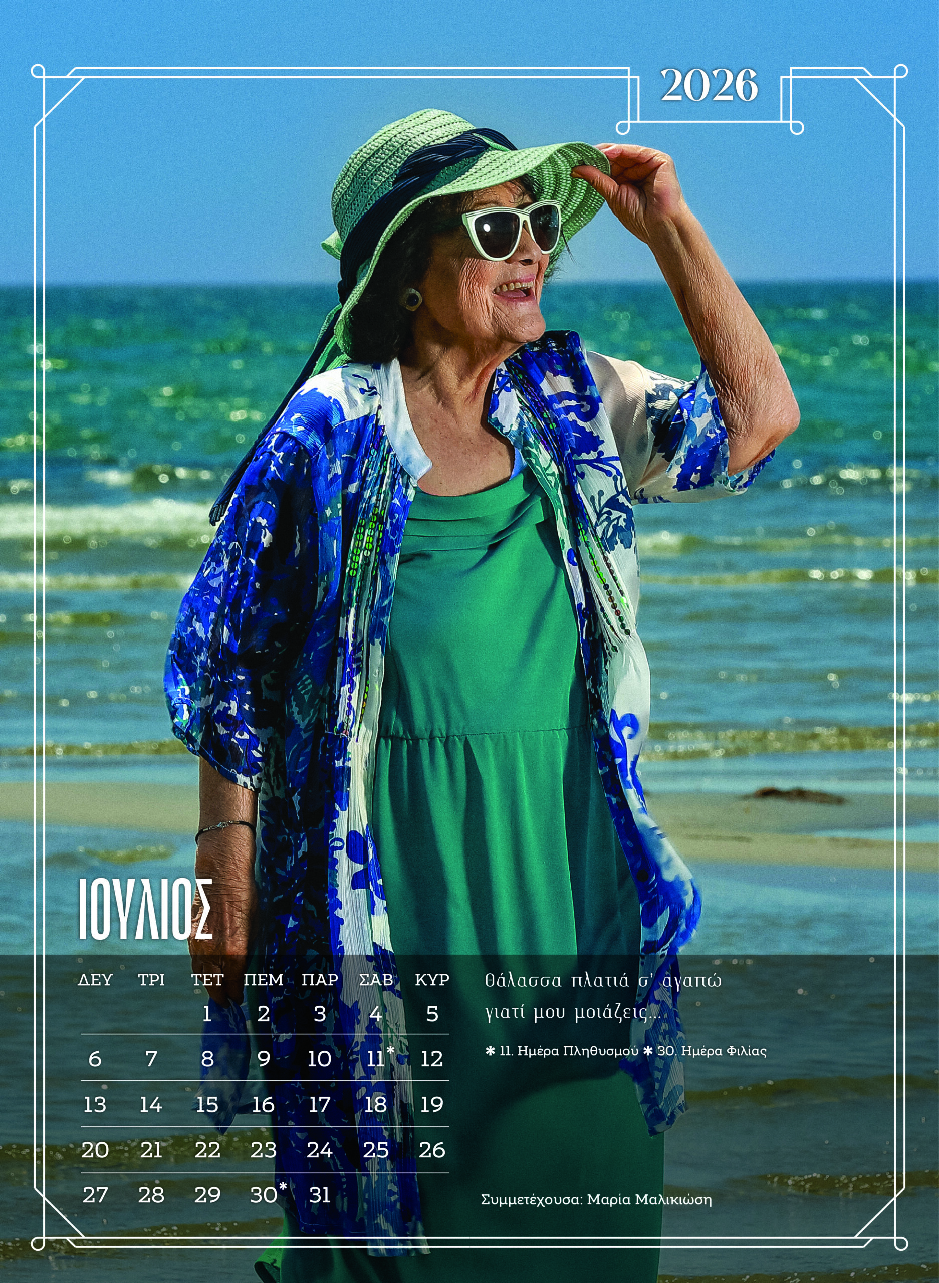 Κάθε μήνας του ημερολογίου φέρνει ένα νέο πρόσωπο. Κάθε σελίδα είναι μια προσωπική αφήγηση, με μηνύματα που συγκινούν. Το ημερολόγιο δεν περιορίζεται στο να μετρά τον χρόνο. Τον αγκαλιάζει. Τον γιορτάζει, μέσα από τα πρόσωπα που δείχνουν ότι η ομορφιά, το χιούμορ, η καλοσύνη και η λάμψη της ψυχής δεν χάνονται με τα χρόνια.